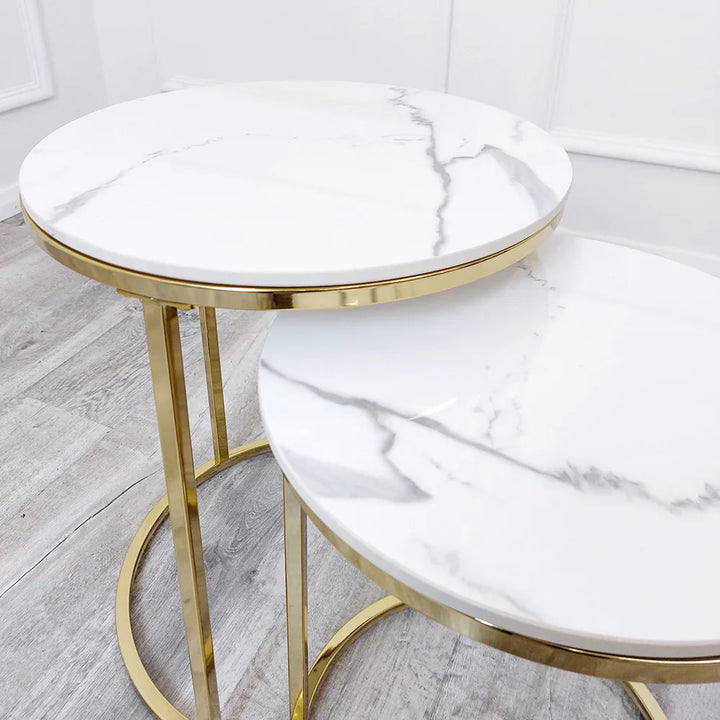 This beautiful 2 piece nest table set features Polar White sintered stone tops placed on simple round gold frames.